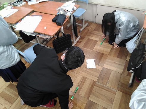 ⇩1年生理科 バネばかりを使って力の向きやつり合いについてグループで実験中