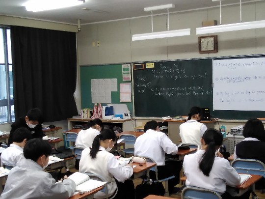 文法に関する穴埋めや選択問題に取り組んでいました。「なぜその答えになるのか」と文法の規則性について近くの友だちと筋道立てて話し合い、学びを深めていきました。