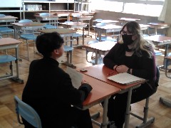 2年生英語は、YEF(四日市市英指導員)に四日市を英語で紹介する取組を進めていました。少し緊張しながらも一人一人別室で問答をしていきました。