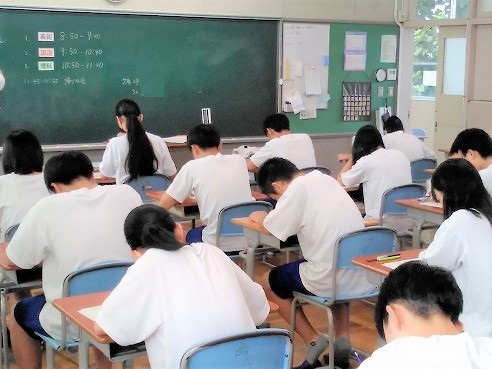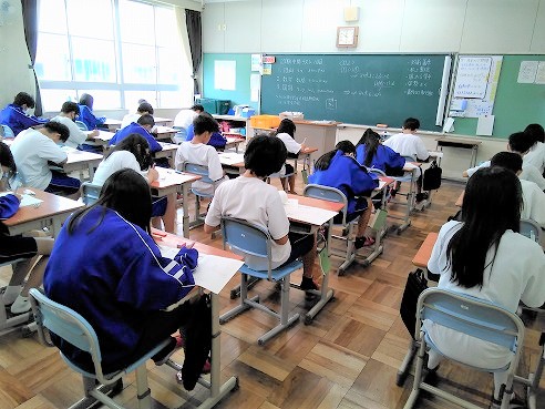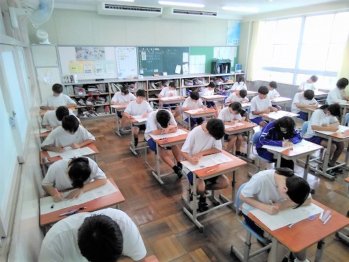 中間テスト1日目はどんよりとした天気となりました。そのような中、教室には鉛筆を走らせる音が響き渡っていました。以前、「全国学調」「みえスタディチエック」の結果分析で、「