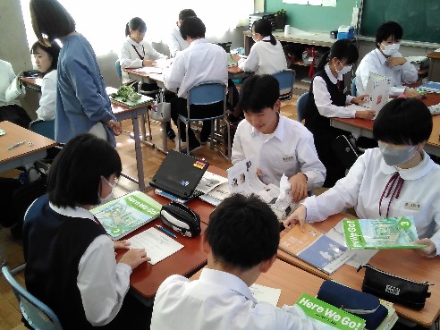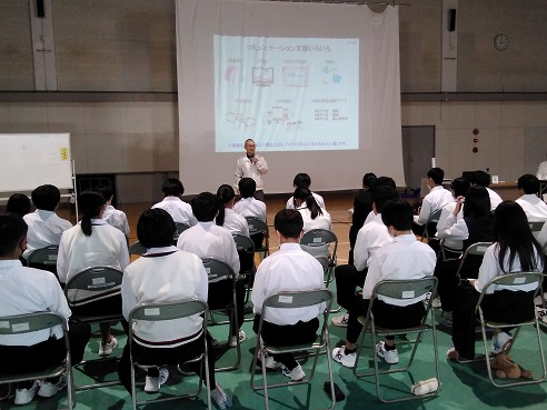 1年生総合で、「ユニバーサルデザイン出前授業」を行いました。ユニバーサルデザインとは、障がいを持っている人たちのためにあるものではなく、みんなが安心して安全に過ごすためのもの(かつ身近にあるもの)であり、他者の立場に立って考えることが、あたたかい関係性につながるというお話でした。