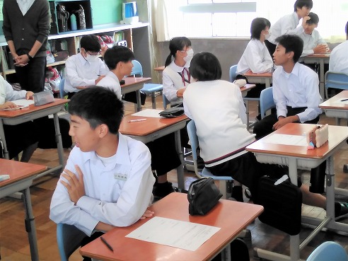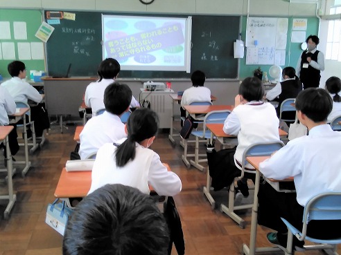 2年生総合は、反差別人権研究所みえ・市教育委員会から講師の方を招いての特別授業でした。SNS等によるデマの拡散や誹謗中傷の事例を通じて、無自覚な人権侵害が他人事ではないことに気づき、自分自身を深く考える様子がうかがえました。