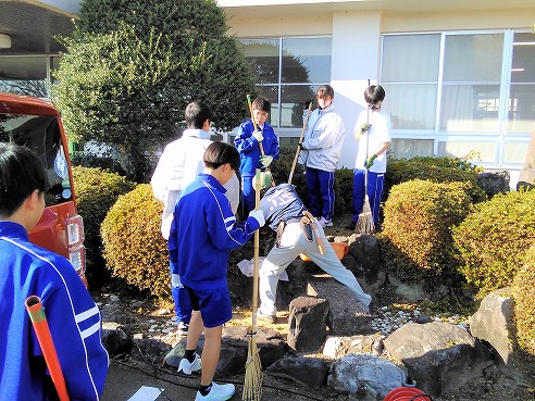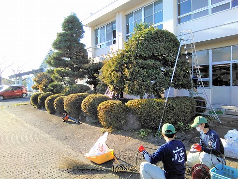午後、3年生が四日市農芸高校の環境造園科の皆さんを迎えて、庭木の剪定作業の手ほどきを受けました。作業着の背中にプリントされた「庭」の文字が示す如くのまさに職人の技で、築山をあっという間にきれいによみがえらせてくれました。3年生の生徒たちにとっては、またとないキャリア体験になったと思います。
