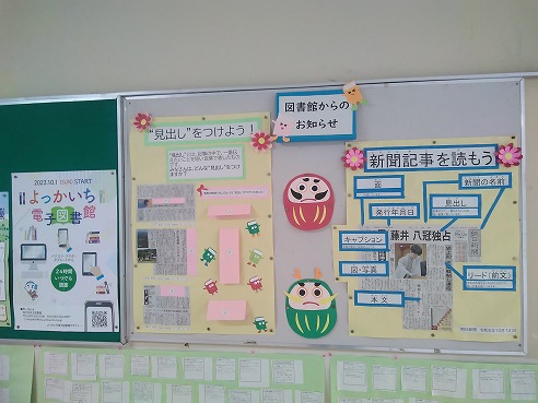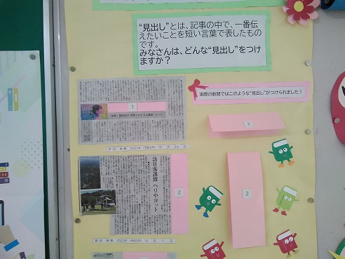 中央廊下の掲示板に図書館司書さんが作成してくれた新聞活用に関する掲示物が掲示されています。今回は記事を読んで見出しを想像する内容になっています。この取組は文を読んで大まかな内容をとらえ要約するトレーニングになります。