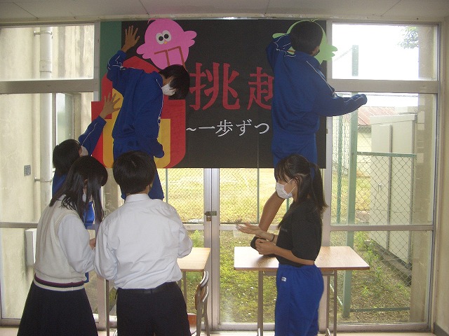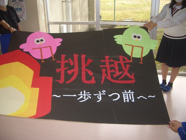 本年度生徒会スローガンが「挑越~一歩ずつ前へ~」に決定しました。昨日、生徒会本部役員が校長室を訪れ、決定までの経緯や思いを伝えてくれました。それによると、「自分で限界を決めずに、何事にも挑戦して、今の自分を越えられるように、一歩ずつ前進していこう」という意味を込めたということでした。