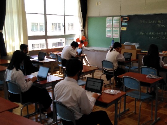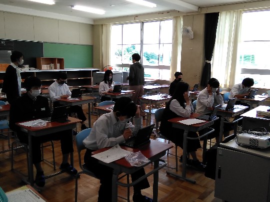 3年生英語で、全国学力・学習状況調査(英語)の「話す」(スピーキング)テストをオンライン方式で実施しました。初のオンライン方式で、コンピューターに口頭で解答する形式で行われました。多少戸惑いもあったかもしれませんが、事前の準備や練習もあって、スムーズに進められていました。