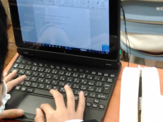 1年生技術は、タイピングの練習をしていました。基本的な文字入力を一通り学ぶと、さっそく自己紹介文の作成に取り掛かりました。知識もスキルも実際のコミュニケーションに生かせるかどうかがカギです。周りの子と助け合いながら作業を進める過程ですでに友達との輪を広げていました。