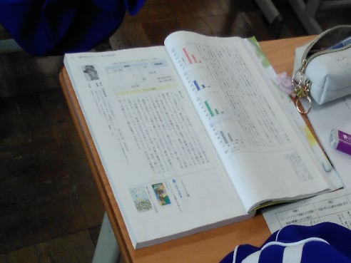 文章の内容を読み取ってワークシートのl問題を解いていきました。文章の読解が正しくできたかどうか、文章に添えられた資料をもとに検証していきました。