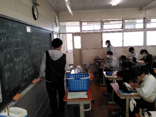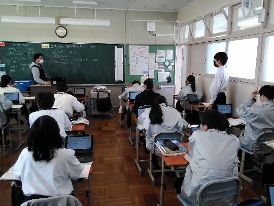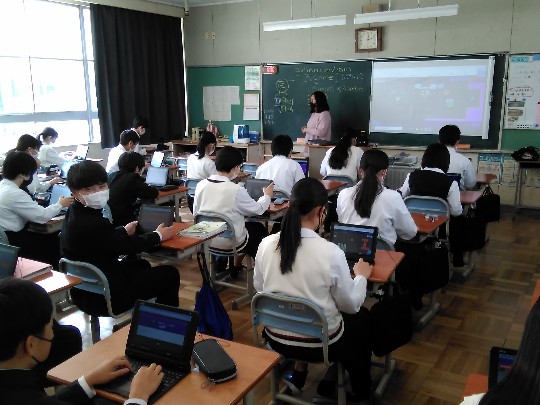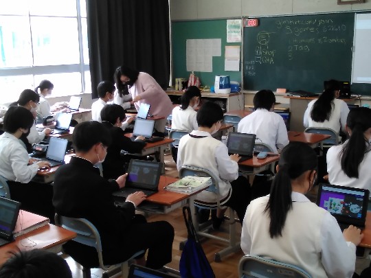 2年生英語は、廊下から声が聞こえるほどゲームで盛り上がっていました。タブレットを使ったゲームのルール説明や指示は、ほぼオールイングリッシュ。教室空間は、まさに英語のシャワーを浴びている感がありました。