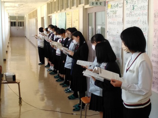 校長室まで2階の音楽室から美しいハーモニーが響いてきました。思わず階段を上って見に行くと、1年生の音楽の授業でした。廊下に一列にきれいに並んで、心を合わせてパート練習に励んでいました。来年度の文化祭が今から楽しみです。