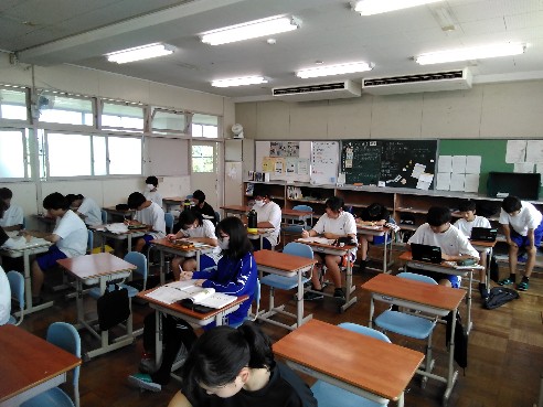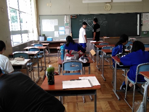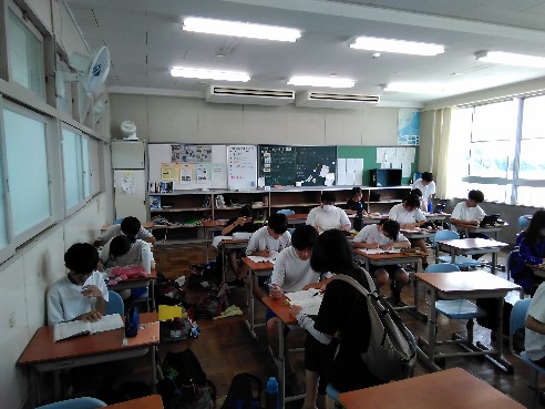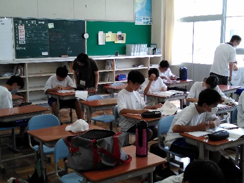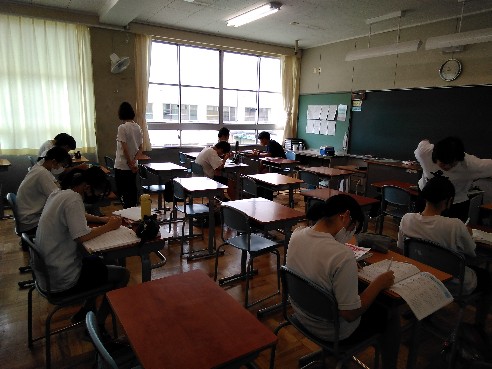 本日は、先月の26・27日に引き続き、夏の学習会を実施しました。生徒たちは夏休みの課題や教科書・ワーク・プリントを持ち寄り、友だちや先生方にわからないところを訊きながら、1学期の復習に励んでいました。
