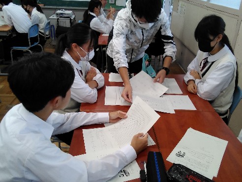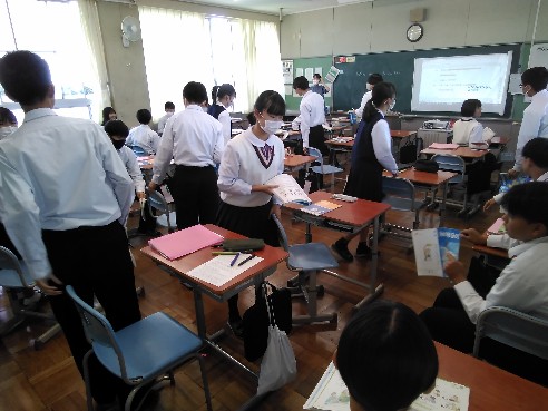 2年生英語では、What anime do you like? という文をもとに対話を進める練習をしていました。次々に相手を変えながら明るく和やかにコミュニケーションを図っていく中で、様々なバリエーションの会話が成立していきました。