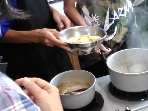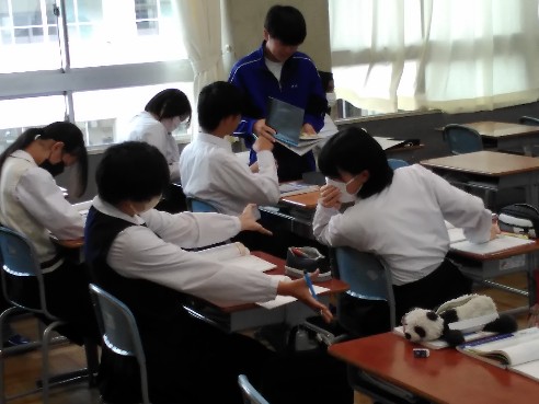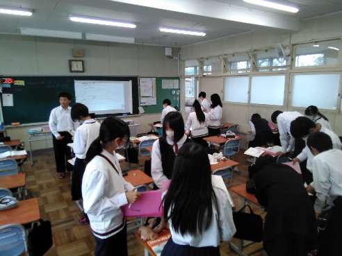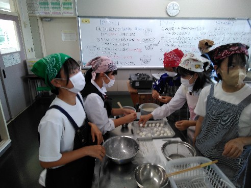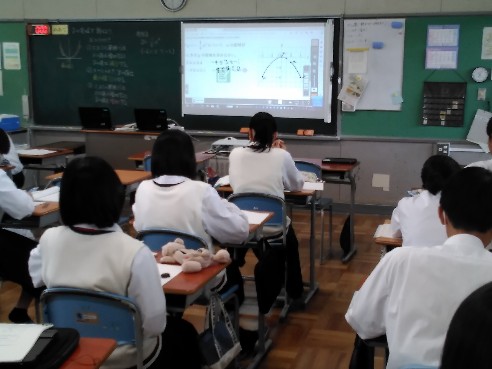 2年生家庭は調理実習で「白玉だんご」を作っていました。秋の味覚さつまいもを添え、みたらしあんをかけたら完成です。さつまいもをゆでたお湯でだんごをゆでるなど、細かなところに配慮しながら協力して作業を進めていました。 1年生英語は 疑問詞の where を使って、場所を尋ねる練習をしていました。今回は学校の中という設定で、校内図も参考にしながら、restroom(トイレ)やgym(体育館)などの単語を使い、コミュニケーションを図っていきました。 3年生数学は二次関数 (y=ax2 )における y の変域を求める学習に取り組んでいました。少人数指導の強みを発揮して個別指導やグループによる学び合いを通じ、それぞれの習熟度に合わせ発展問題や基礎問題に取り組んでいきました。