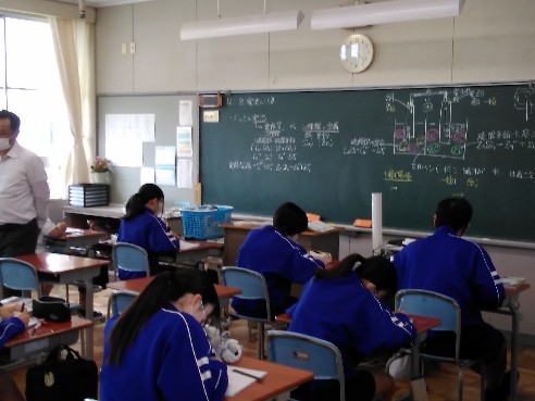 3年生理科は黒板にいっぱいにカラーチョークで書かれた元素記号が並んでいました。金属の水溶液による電池の陽極と陰極に現れる物質に着目し、イオンや電気の流れという目では見えないものの動きを筋道立てて考え、理解を深めていきました。