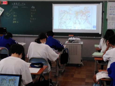 2年生社会は北九州の工業の推移を地図から読み取っていました。近年はシエア低下により四大工業地帯から工業地域へ降格しています。生産の内訳が鉄から自動車などへシフトしており、日本全体の変化と一致している様子を感じたことと思います。