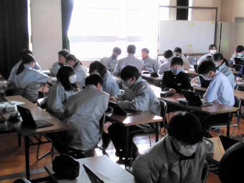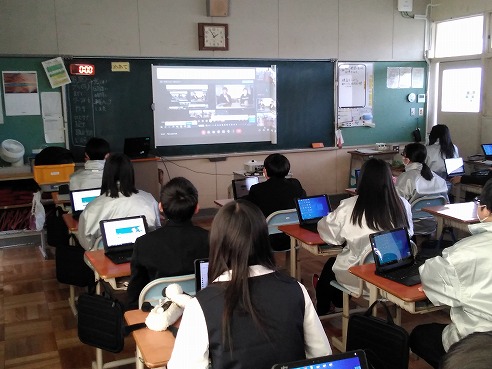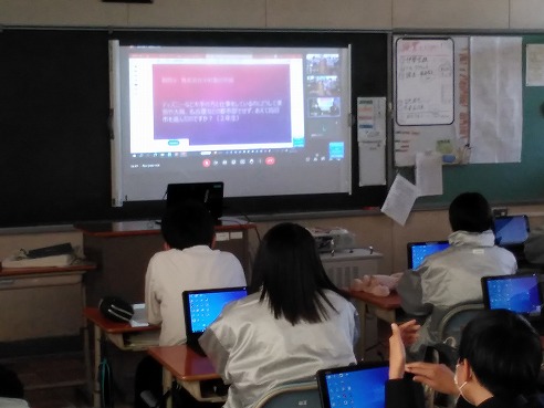 1年生は教室からリーモートで参加                2年生代表による感謝の言葉
