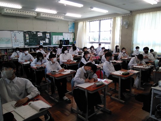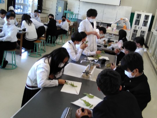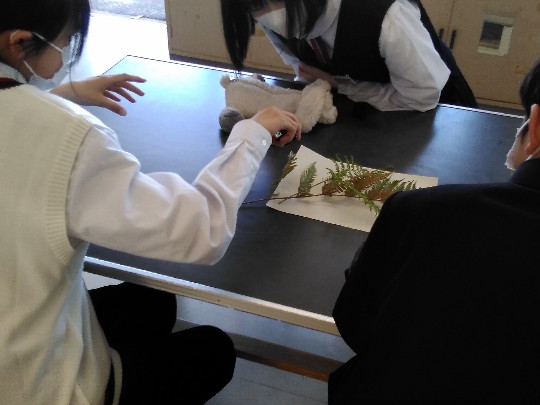 1年生理科では、学校て採集したシダ植物をルーペで観察しました。葉の裏側には虫の卵のような丸い胞子嚢があり、その中に胞子が格納されているのがわかります。思考を働かせて観察し、機能や仕組と関連付けることで、学びを深めていました。