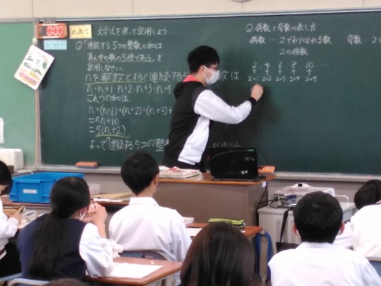 連続する5つの数の和は真ん中の数の5倍である」は、最初の数をnとおくと、下線部が n+(n+1)+(n+2)+(n+3)+(N+4)と表され、5n+10=5(n+2)となるので、確かに証明されました。数式は言語のようです。