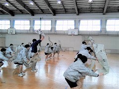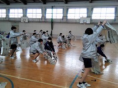 ⇩2年生体育 新聞紙をなびかせ ちぎって空中へ放り投げ 表現のアクセントに