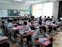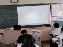 1年生英語は静謐な雰囲気の中、ひたすらノートに向かう姿がありました。一方、理科では、河川の働きにより扇状地が形成される様子の動画を視聴していました。本日は、静と動のそれぞれの姿で学びが深まっていく様子を感じることができました。