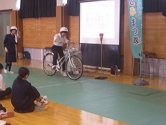 今日の6時間目に1年生は四日市交通安全協議会の方にお越しいただき、自転車交通安全教室を実施しました。講演を聞いた後、代表の人が実際に運転して、安全な自転車の乗り方について学びました。登下校に自転車を使っている人が多いと思いますが、特に1年生は自転車での通学を始めたばかりですから、気を付けて運転してほしいと思います。生徒の皆さんが毎日無事で登下校してくれることを願って、教職員だけでなく、保護者や地域の方も協力してくださっていることを忘れないでくださいね。