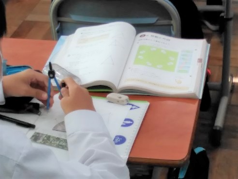 平行移動・回転移動・対称移動などを作図して学んでいます。よくわからないことが、「はっ」と見える瞬間があります。まわりの子との話し合いや先生からのヒントなどを手掛かりに、答えを自分自身で手繰り寄せていきました。