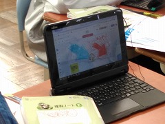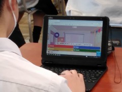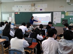 3年生英語は、タブレットを活用して4択のクイズ形式の問題に挑戦しました。空欄に当てはまる1語を答えて英作文を完成するという趣旨の問題ですが、英文法の要所をついた曲者の選択肢を比べながら、入試へ向けた準備を進めていきました。