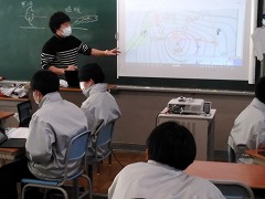 2年生理科は、天気図をもとに寒冷前線と温暖前線付近の空気の重なり方を比べ、それぞれの様子を描きました。天気図は上空からみたものですが、これをもとに断面を想像して図に表す過程で様々な考えが出され、論理的思考が深まりました。