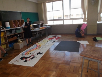 別室では、生徒会の人たちが、本年度用の学校スローガンの幕を作成していました。