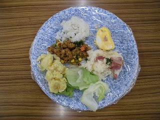 ライカレー、ハムとチーズのオムレツ、ベーコンと卵のチャーハン、コーン蒸しパンです。被災した時を想定