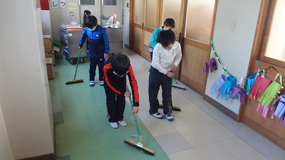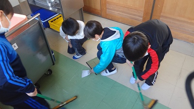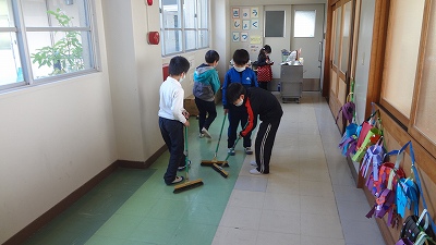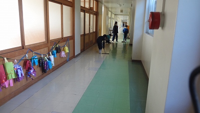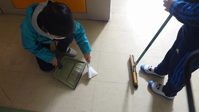 今日は、特別日課により通常の掃除時間はなく、「簡単掃除」でしたが、1年生教室前から給食室までの廊下を、一生懸命に掃除をする姿が見られました。ほうきやちりとりの使い方にも随分慣れてきたようです。上手に掃除することができました。