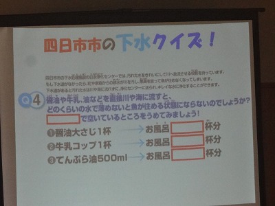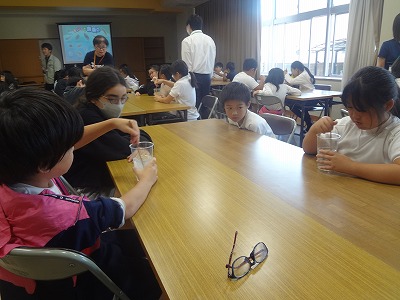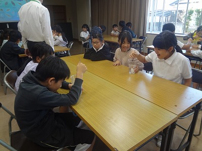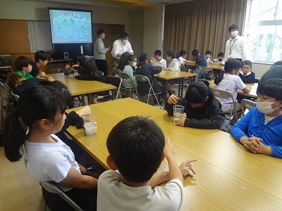 今日は、四日市市上下水道局の職員の方にご来校いただき、出前授業をして頂きました。授業では、①トイレットペーパー、②ティッシュペーパーをそれぞれ水の中に入れてかき混ぜると、どのように変化するかを予想を立てて実験する時間がありました。