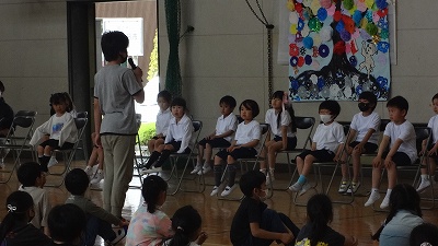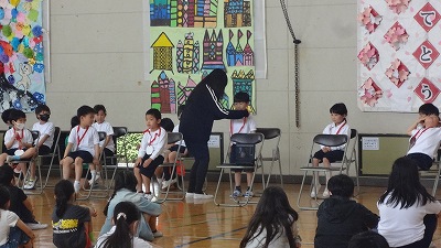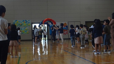 続いて、1年生を迎える会です。花道を通って1年生が入場しました。児童会役員からの歓迎の言葉、校歌合唱のプレゼント、お祝いのメダルのプレゼント等があり、1年生の子どもたちはとても嬉しそうでした。
