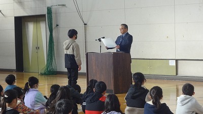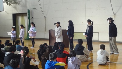 続いて、各クラス代表によるスピーチです。冬休みの思い出や3学期に頑張りたいことについて話しました。「なわとびを頑張りたい」「友達ともっと仲良くしたい」「勉強に力を入れたい」等、それぞれの思いを語りました。
