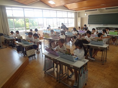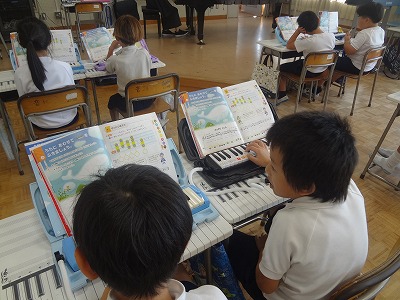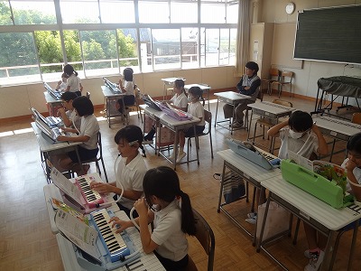 鍵盤ハーモニカを用いて、旋律遊びをしながら「ぷっかりくじら」を吹きました。ペアで教え合い、聞き合いながら練習をしています。
