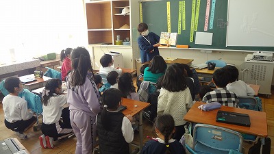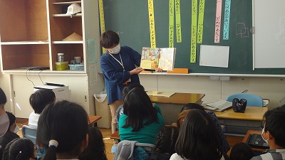 今日は、図書ボランティアさんが来校され、2年生に読み聞かせをしてくださいました。2冊の本をご紹介くださいましたが、子どもたちは絵本の世界に釘付けでした。