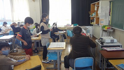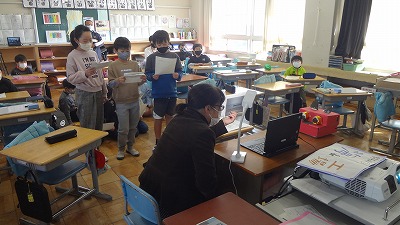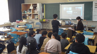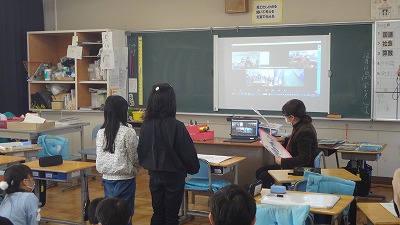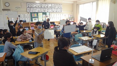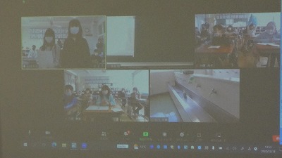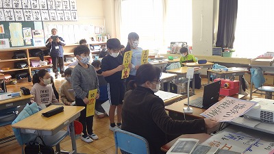 授業では、お互いに学校紹介をした後、内部小学校からは都道府県クイズが出題されました。塩浜小学校の子どもたちは各グループで相談し、回答をホワイトボードに書いてカメラに向かって見せます。まるでクイズ番組に出演しているタレントのような感じで大いに盛り上がりました。その後、読書活動推進校である塩浜小学校からは「おすすめの本紹介」を行いました。