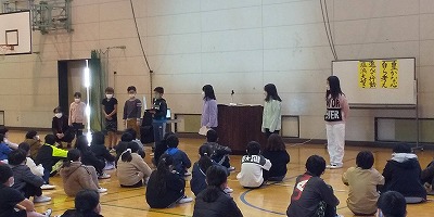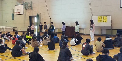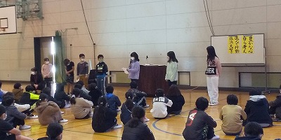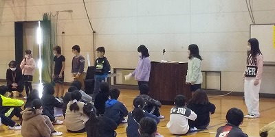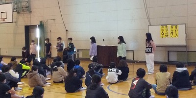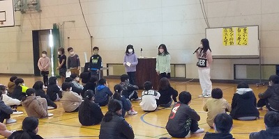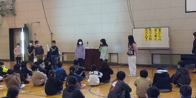 次は、「2学期に頑張ったこと・3学期に頑張りたいこと」を各学級の代表者がスピーチをしました。友達と協力できたこと、九九や漢字等の学習を頑張ったこと、字を丁寧に書くことを意識したこと、持久走記録で走り切ったこと等を堂々と話すことができました。