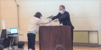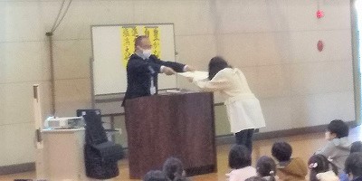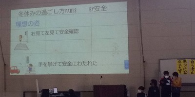 その後、習字や人権ポスターについての表彰式や、児童会から「2学期に塩浜っ子が頑張ったこと・冬休みの生活で気をつけること」についての話がありました。それぞれの頑張りが見えた、温かい時間になりました。