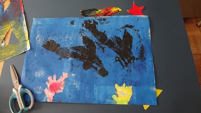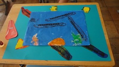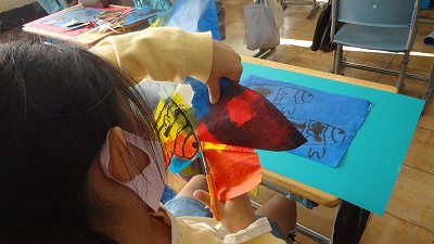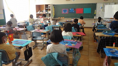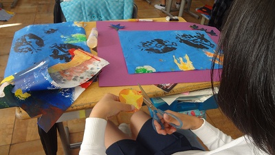 3年生の図画工作科では、紙版画を組み合わせて、海の中の生き物を表現しています。イソギンチャクの生えた海底にイルカが潜ったところを表現している子もいて、それぞれの世界が表現されています。