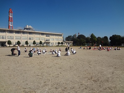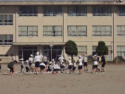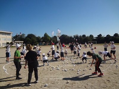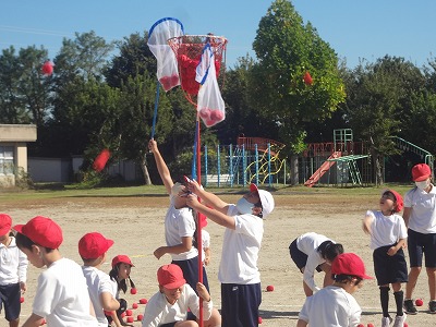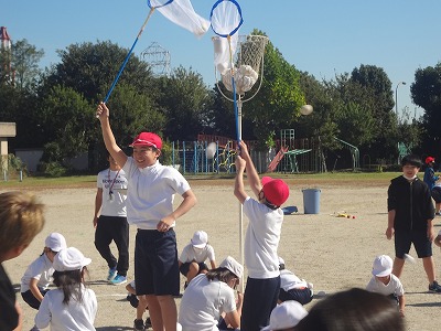 1・6年のペア学年の競技は、玉入れです。1・6年で協力して玉入れをしますが、「あれれ・・・」なんと、途中から玉入れのジャマをするおじゃま虫が・・・。本番は、赤白どちらがたくさん入るでしょうか!?