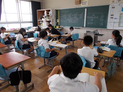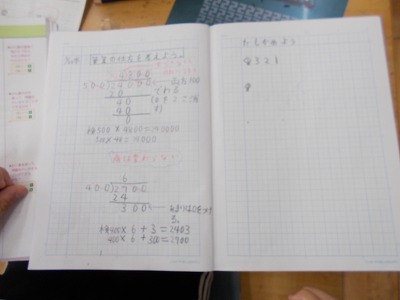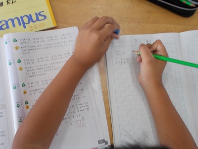 4年生では、今、わり算の筆算に取り組んでいます。桁数の多いわり算の筆算を工夫して計算する学習に取り組んでいます。少人数授業により、「じっくり、ゆっくり学びたいコース」「どんどん問題を解いていきたいコース」等に分かれて学習をしています。