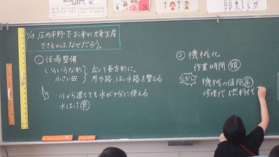 今日は、「庄内平野でお米が大量生産できるのはなぜだろう」という疑問を解決するために、みんなで調べたり考えて意見交流したりしながら、学習を深めました。「トラクターって、こんなに高いんだ!」「みんなで共用することで、負担を減らすことができるんじゃないかな!?」等、子どもたちの呟きが聞こえてきました。