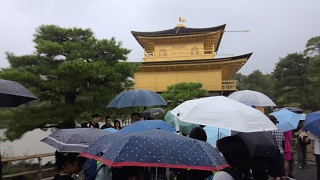 最初の見学地、金閣寺に到着しました。あいにく雨が降ってきましたが、雨空の中でも金閣寺は輝いました。
