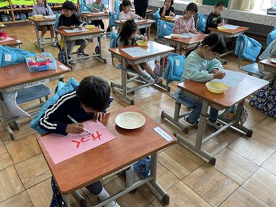 1年生が書写の時間に、水書き用の筆ペンと水書板を使って字を書く練習をしました。