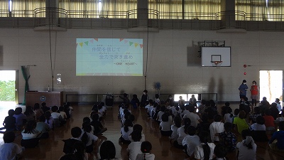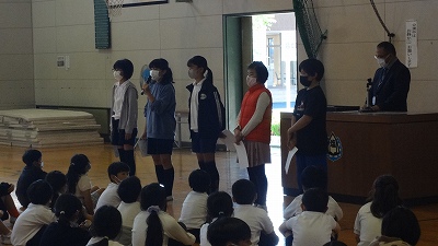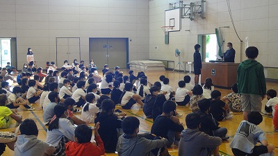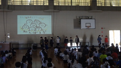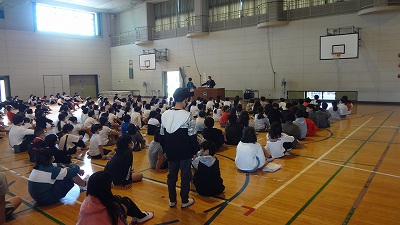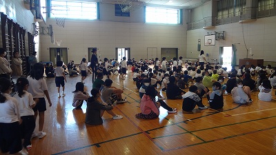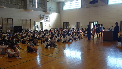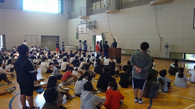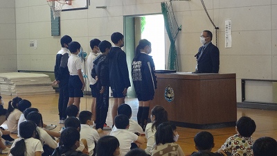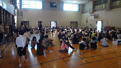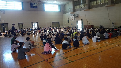今日は、5限目に学校集会がありました。初めに高学年が体育館に入場しましたが、静かに並んで入場する姿が見られました。高学年が静かに座って待っていると、続いて入場する学年も高学年に習って静かに入場しました。最後に1年生が静か上手に入場し、良い雰囲気で学校集会が始まりました。