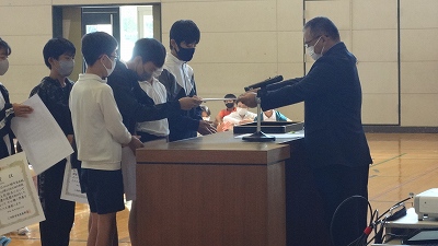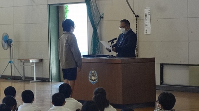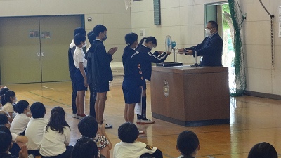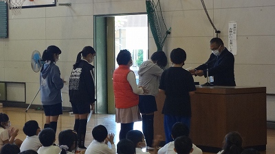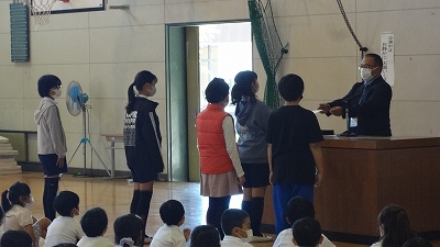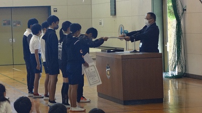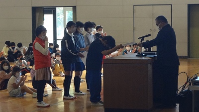 集会では、児童会役員・学級委員・委員会委員長の認証式、三泗小中社会科展・科学展・三泗陸上の表彰、児童会役員からの重大発表「運動会のスローガン」の紹介がありました。集会終了後の体育館の窓閉めや戸締りは、6年生が率先して行動してくれていました。爽やかな秋風とともに、主体的に活動する子どもたちの姿がたくさん見られた学校集会でした。