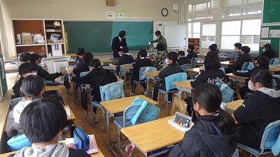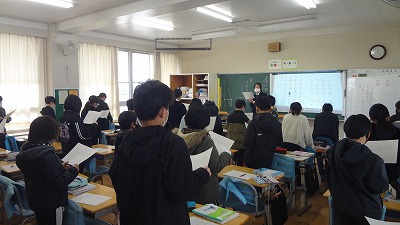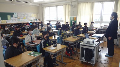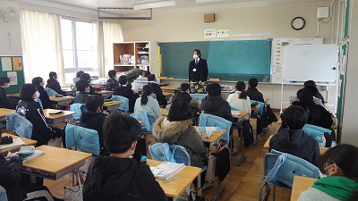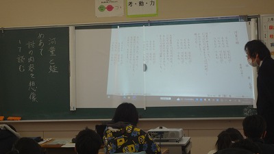 今日は、塩浜中学校の国語科の先生が5年生に乗り入れ授業に来てくださいました。保育園・こども園・小学校・中学校の滑らかな縦の接続を意識して、子どもたちが過剰な段差を感じずに学びを深められるように取り組んでいる「学びの一体化」の取組の一つです。