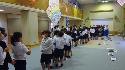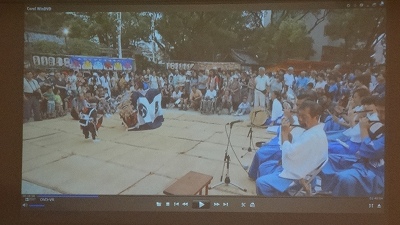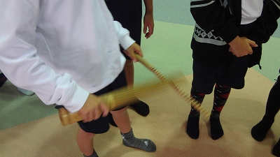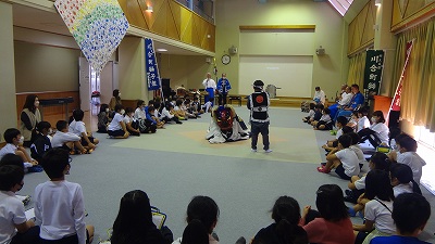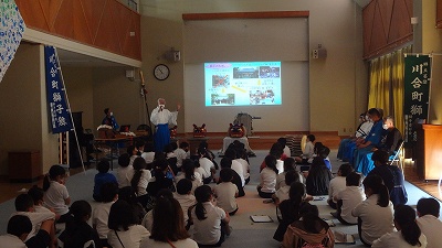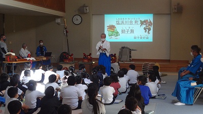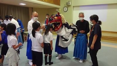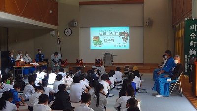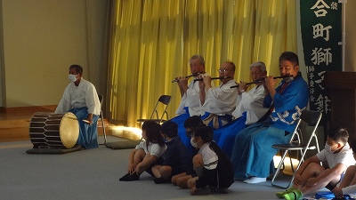 今日は、川合町の獅子愛好会の皆さんにお世話になり、獅子舞の歴史・伝統芸能について学ぶ機会をいただきました。「昨日の塩浜地区文化祭で見たよ!」という子もいれば、初めて目の当たりにする子もいて、見慣れない道具に興味津々!!本物に触れる機会に接し、子どもたちは目を輝かせていました。