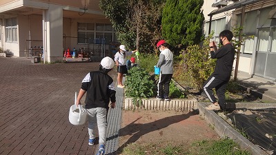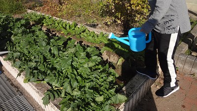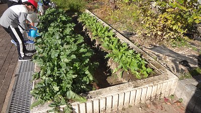 はまっこでは、学級園で大根を育てています。手前が「肥料あり」、奥が「肥料なし」で、その違いを比較しながら育てています。